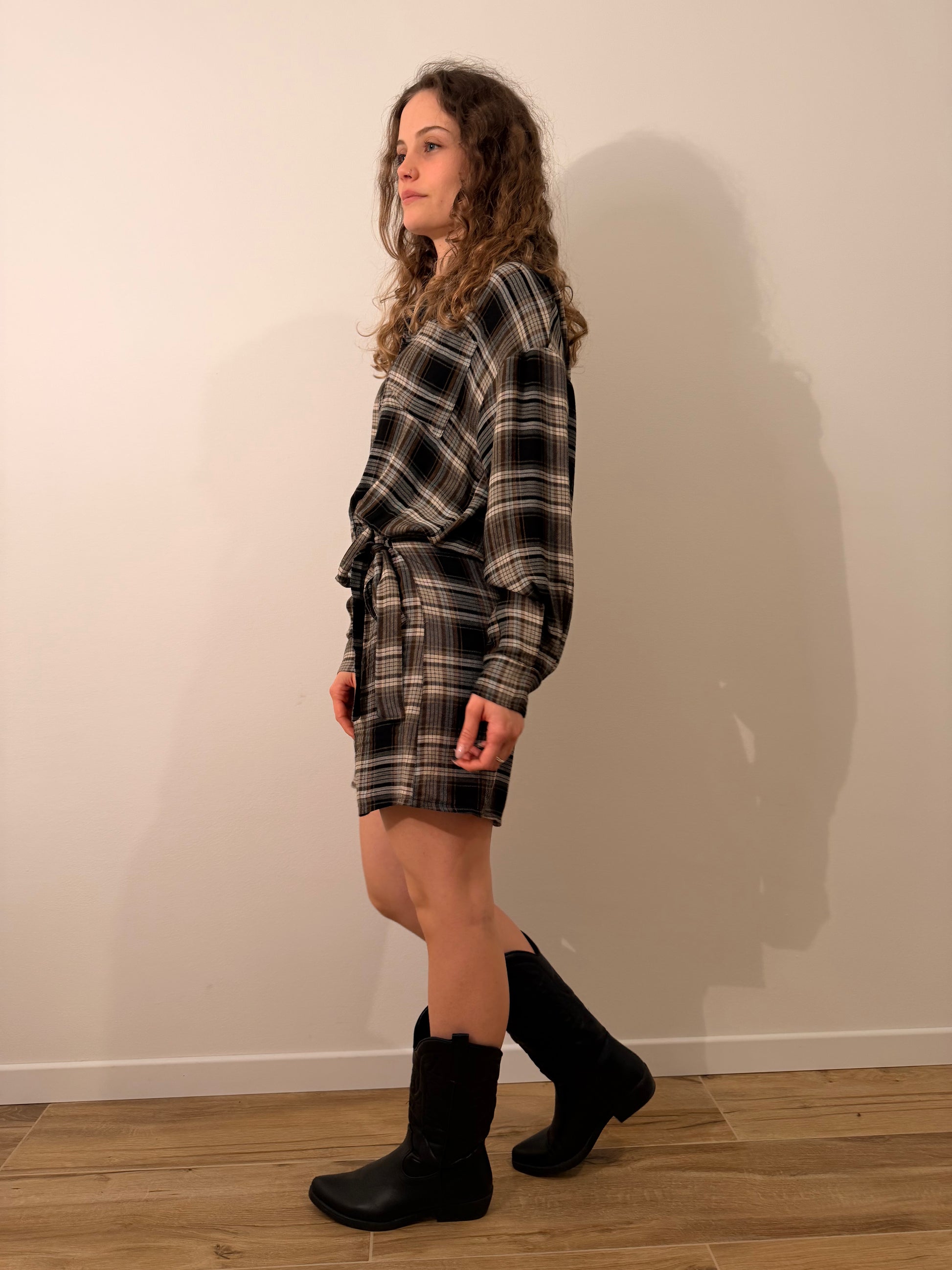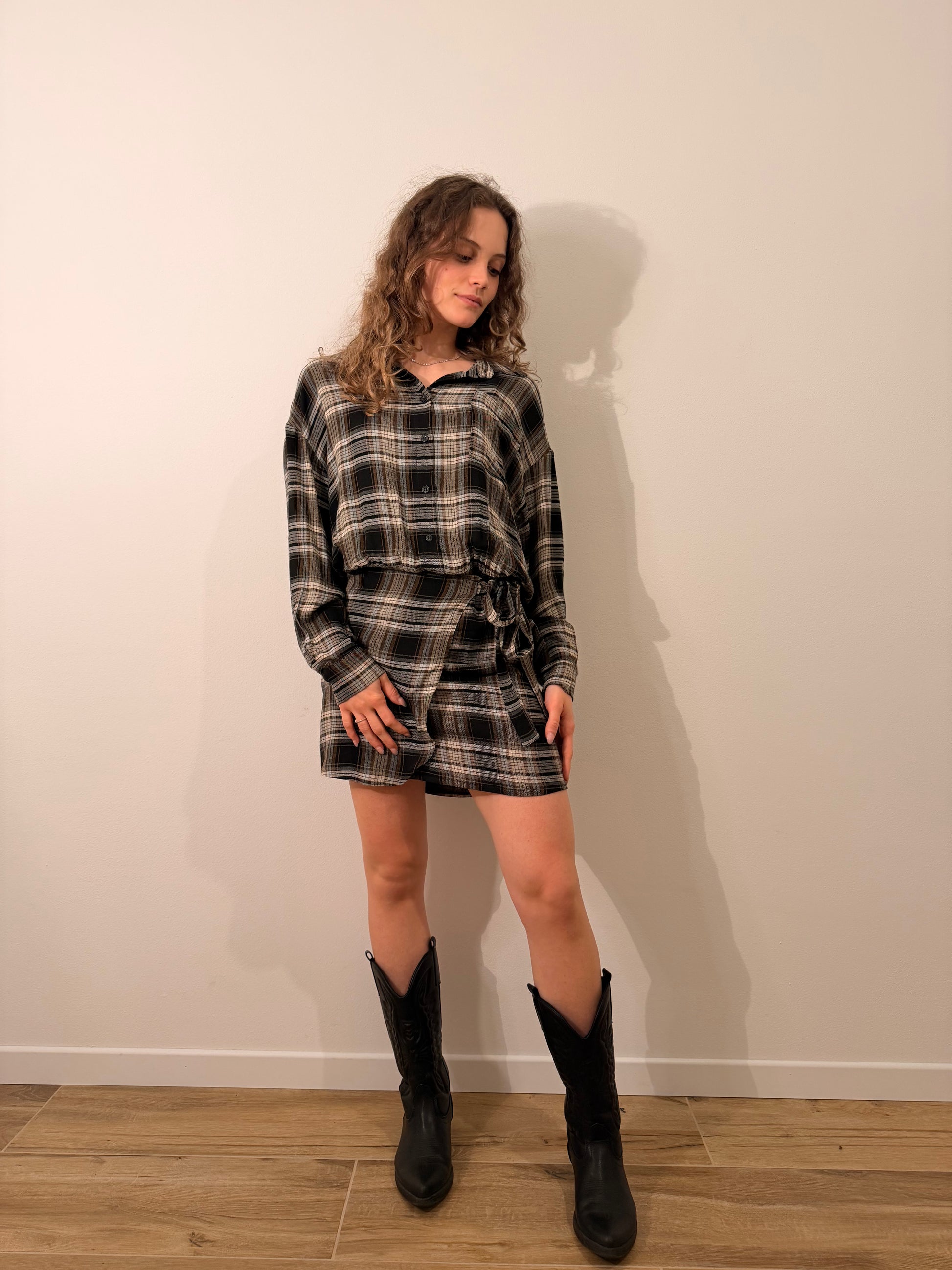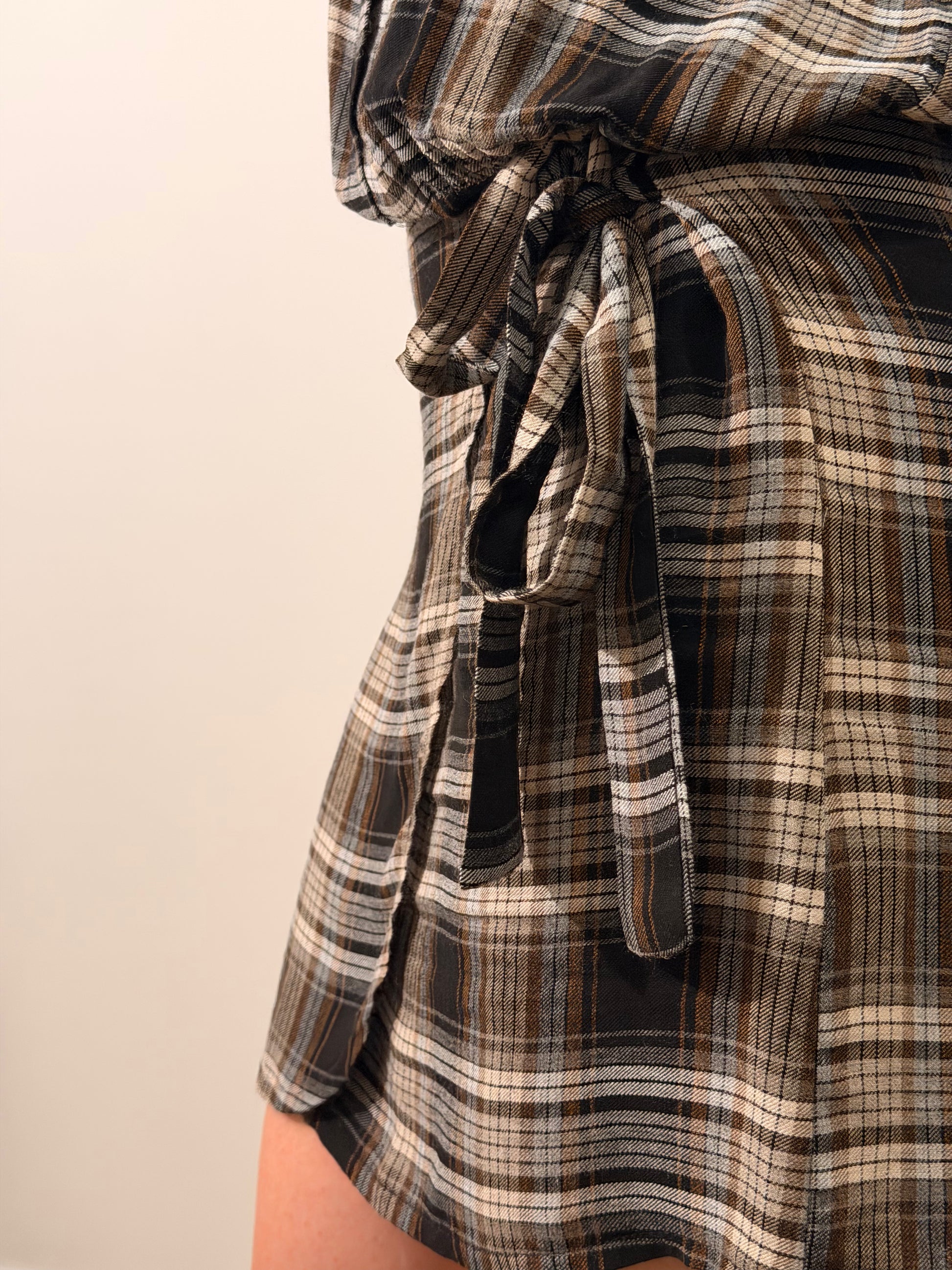Abito a quadri stile camicia con bottoni e finta gonna con nodo