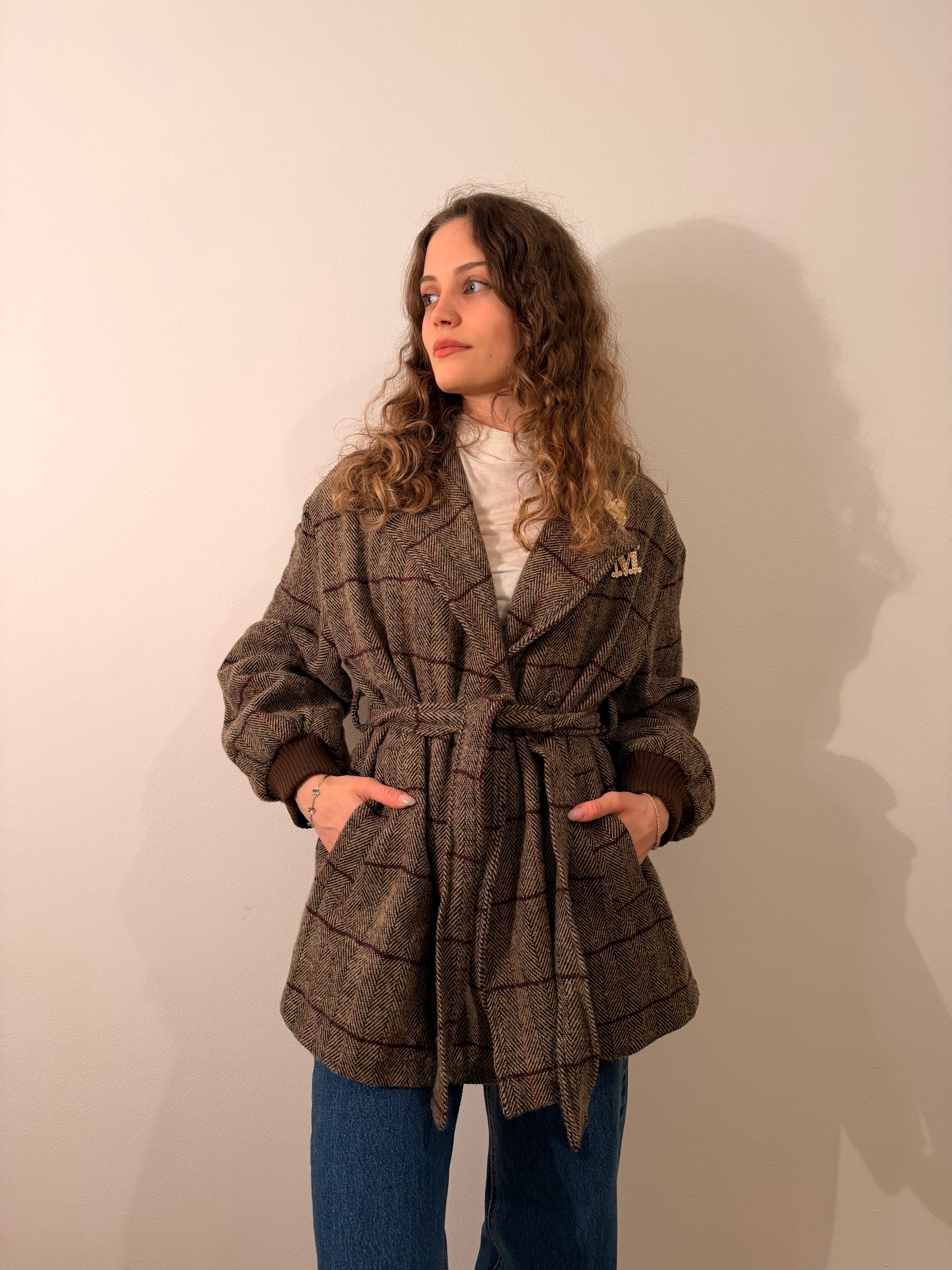 Cappotto con interno in fodera, polsini in maglia tono su tono, cintura in vita regolabile, bottoni di chiusura ermetici e spille di decoro